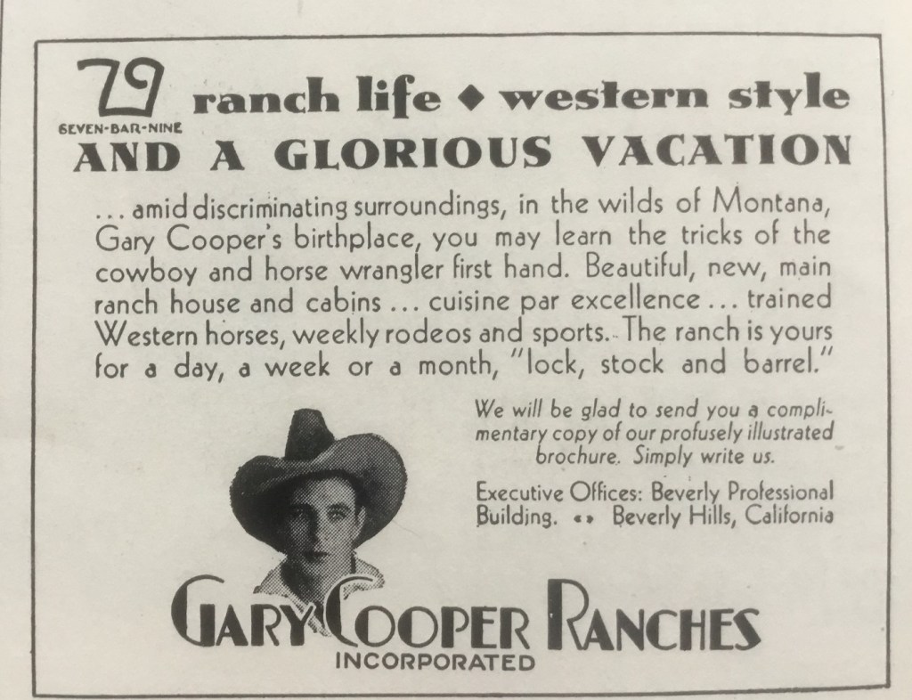 This says something about how popular dude ranches had become by the 1930s. Celebrities such as Errol Flynn and Joel McCrea claimed they planned to open ranches of their own. This never happened, though Gary Cooper had a dude ranch for a couple of years on the property where he grew up in Helena, Montana. (It didn’t last long, probably because people expected to see the movie star when they got off the train, and he was rarely if ever there.)