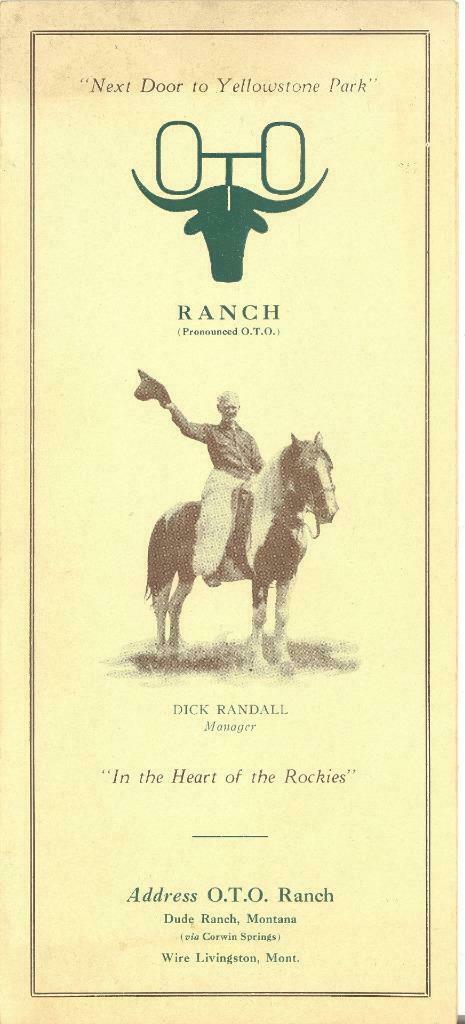 By 1912 the Randalls’ home was officially a dude ranch, and was soon named for their cattle brand: O.T.O., which was simply a collection of letters that was easy to turn into a brand and read on the side of a steer or a saddle.