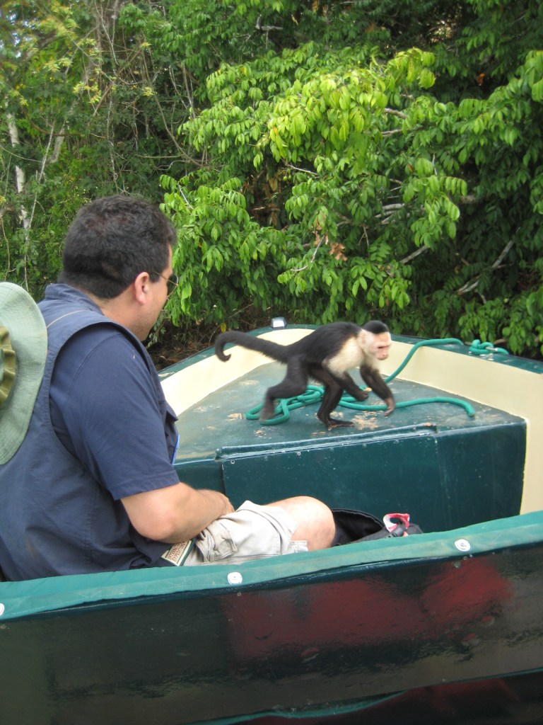 We got back into the boat and putted over to a thicket of green, where huge trees dipped over the water. Hernán said to watch the bushes, as he pulled peanuts and cut up pieces of banana from his pack and began to whistle. A moment later Capuchin monkeys came out of the bushes to grab the food from our hands.