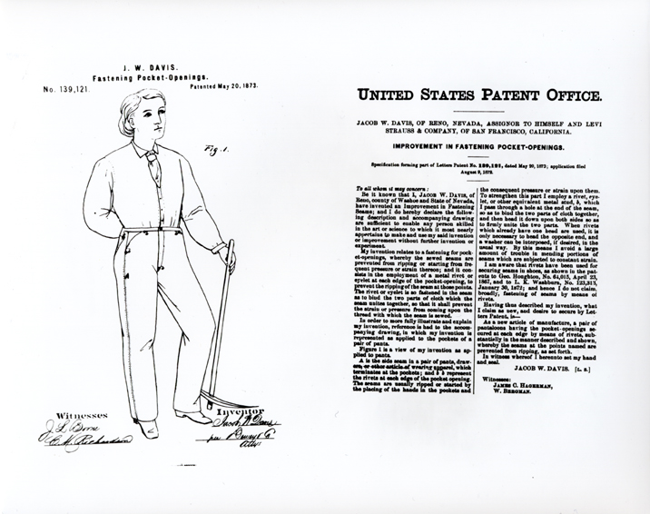 On that date, San Francisco dry goods merchant and philanthropist Levi Strauss, and Reno, Nevada tailor Jacob Davis were granted patent number 139,121 for an “Improvement in Fastening Pocket-Openings.” Davis had started making denim pants with metal rivets in the pocket corners to keep them from ripping. He realized he had invented a new kind of work pants, so he suggested to Levi that they take out a patent on the process together. Levi had the vision and the funding; Davis had the manufacturing skills. Within months they were making the copper riveted waist overalls that we know today as Levi’s 501 jeans.