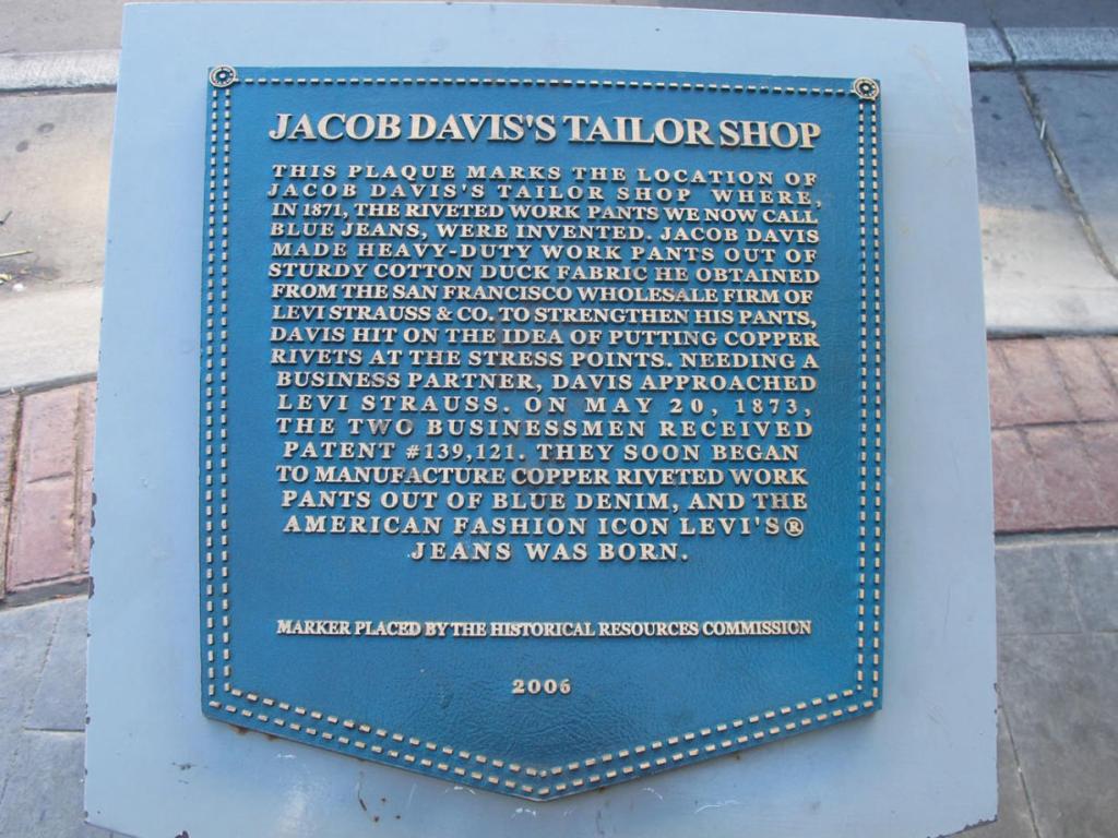 Reno Historical Resources Commission created a plaque commemorating the site of Jacob Davis’s tailoring shop. The group then organized a ceremony to install the plaque at the shop’s original Virginia Street location — on May 20, the patent anniversary date. They asked me to come to the event and to bring the oldest pair of 501 jeans in the company’s Archives. I told them I would be happy to, but they would have to provide security, because the jeans — from 1879 — were, well, priceless.