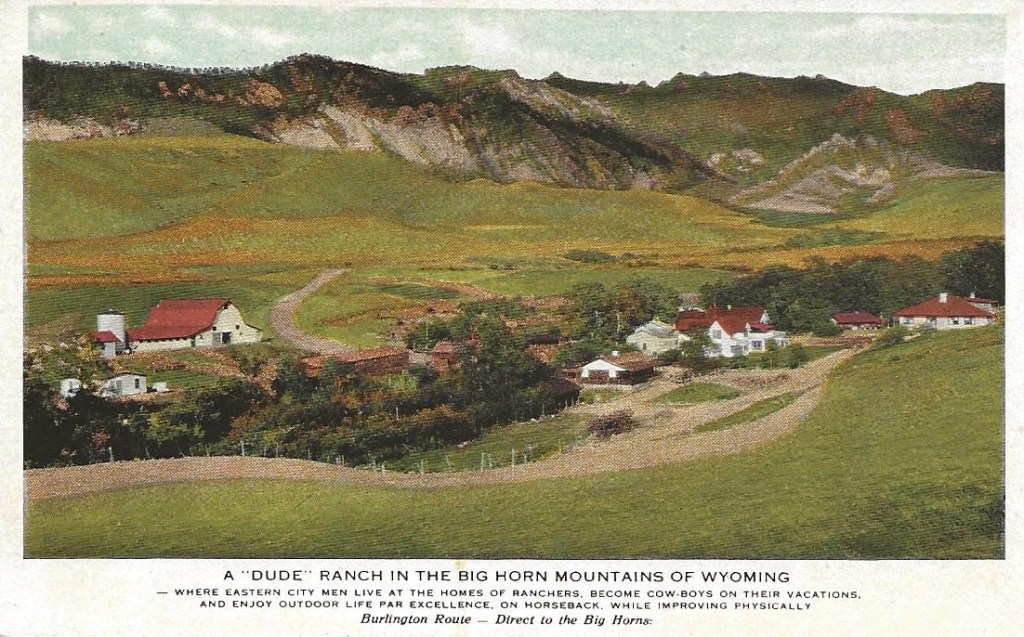 The oldest card, from 1901-1907, was of the Square G Ranch in Wyoming, which was actually a tourist camp, rather than a dude ranch. Some of the buildings were repurposed in the 1960s for tent camping.