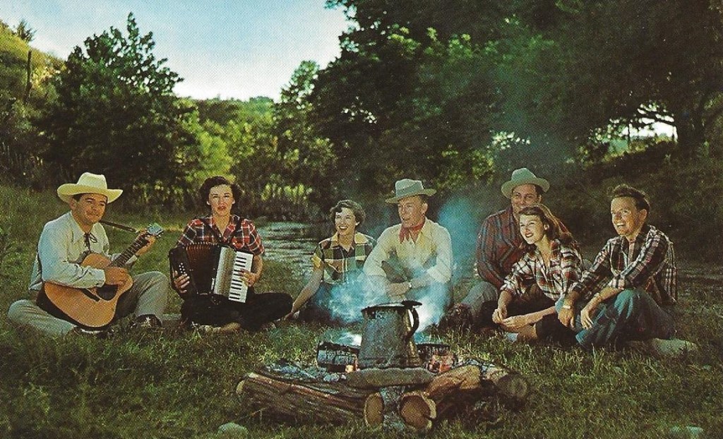 Each one was a treat. The photo on the card at the top of this post was taken by someone from the Texas Highway Department, and captioned simply: “Campfire At Twilight on a Dude Ranch,” printed in 1959.